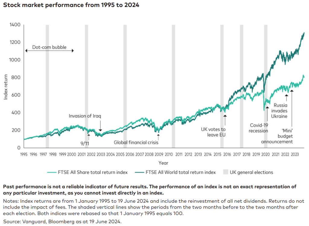 As we have all noticed in recent weeks elections generate lots of headlines. So it might seem like an important consideration when making investments Vanguard have analysed the performance of a balanced portfolio of 60% UK shares and 40% UK bonds between January 1987 and May 2024. During that time, there have been 10 general election periods in the UK (including the election on 4 July). They looked at portfolio performance in the period from the five months before each election to the five months after and then compared this with performance during other times and found no statistical difference in portfolio performance!