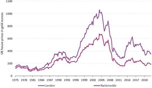 There’s been plenty in the press about slowing annual house price growth. What if you were to lot a chart showing how many ounces of gold you need to buy a house in the UK? Prices are not as lofty as you might think in those terms.​
